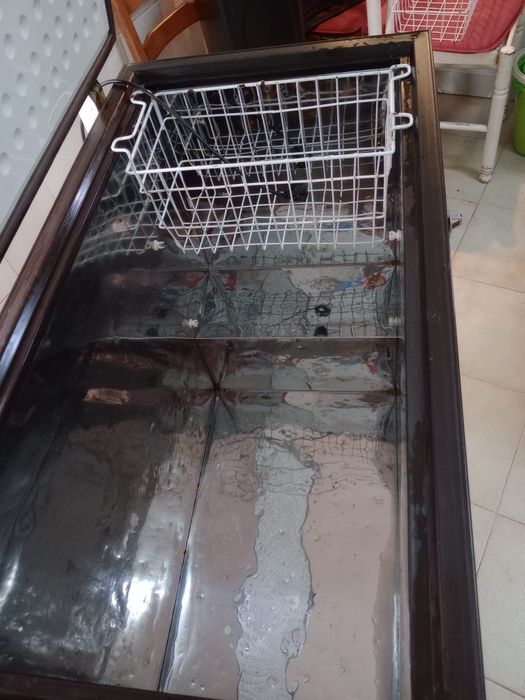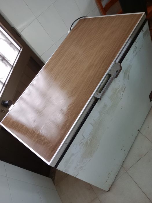 Freezer de arca usado, com marcas de uso visíveis na imagem. Possui tampa de madeira e estrutura metálica. Pode ser útil para armazenar alimentos congelados.