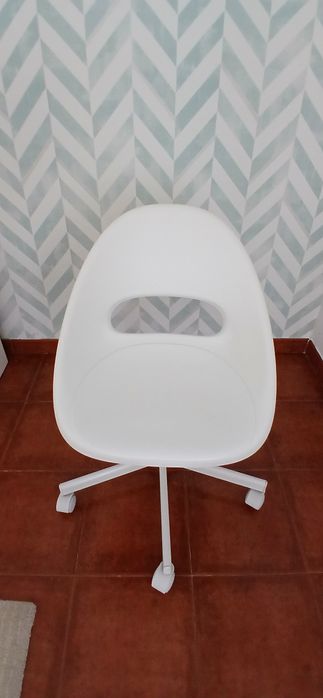 Cadeira de escritório giratória e ajustável da IKEA. Feita de plástico branco resistente, com rodízios para facilitar a movimentação. Ideal para usar em casa ou no escritório, proporcionando conforto e mobilidade durante o trabalho.