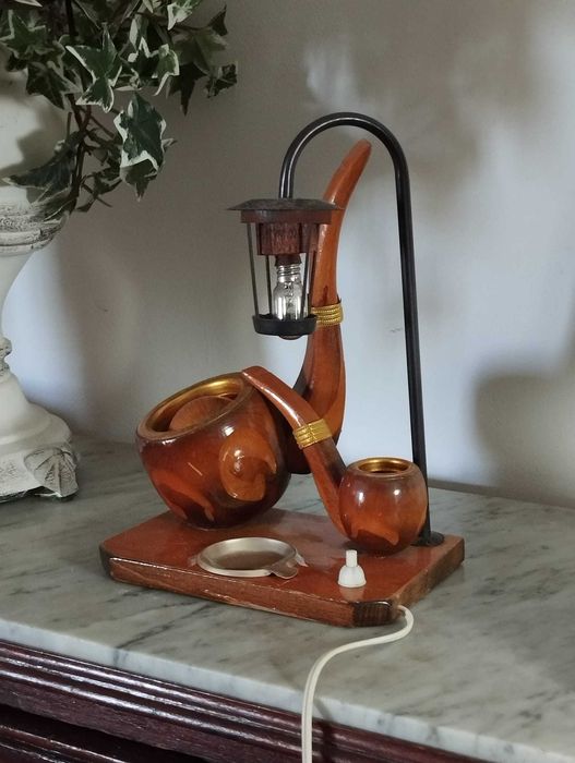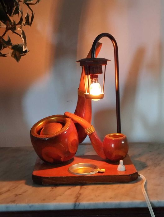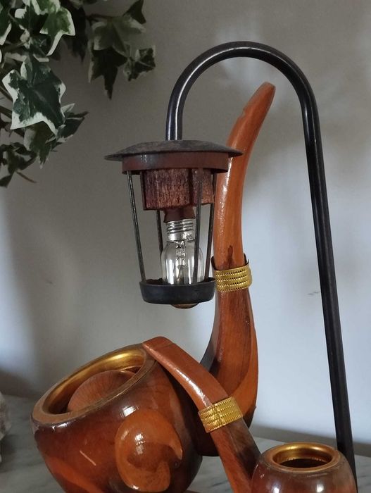 Peça decorativa única que combina candeeiro e cinzeiro, com um design inspirado em cachimbos.