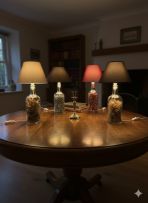 Candeeiros de mesa feitos com garrafas de licor, uísque e vinho recicladas. Um item único e ecológico, que combina design e sustentabilidade. A base é composta por garrafas coloridas, criando um efeito decorativo interessante. O abajur em tecido as cores complementam o visual, tornando esta peça um acessório de iluminação original e atraente para a sua casa. Ideal para uma presente, aniversario ou para si próprio. Novo modelo.
