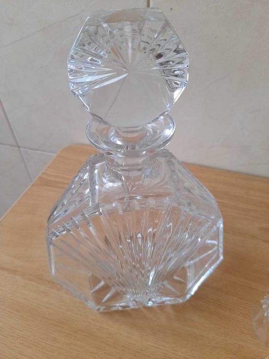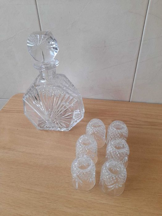 Conjunto de garrafa e copos de licor em vidro lapidado, com design clássico.