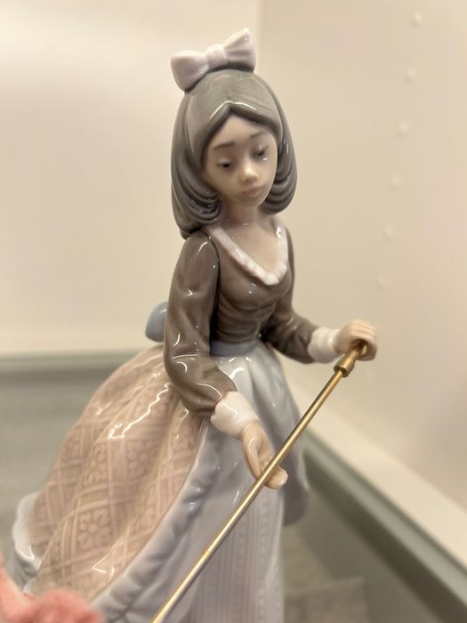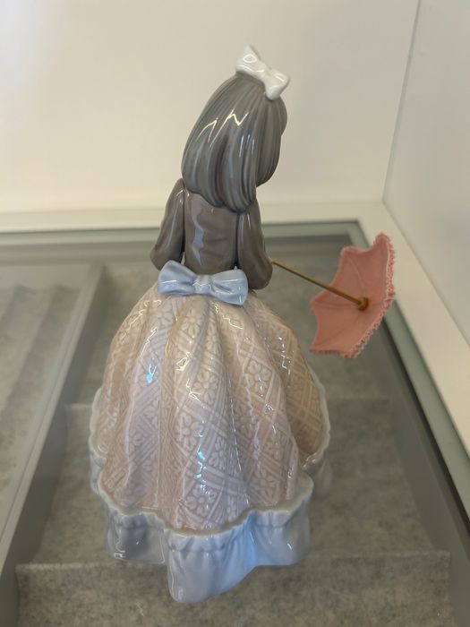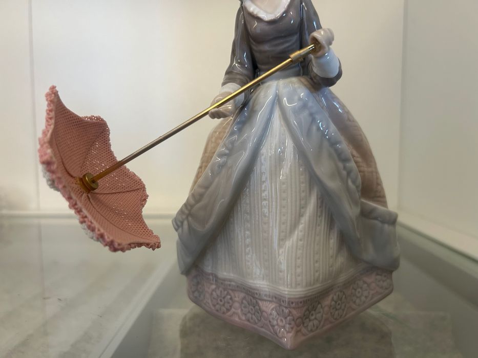 A figura encontra-se em estado irrepreensível. Destaca-se pelo seu guarda-sol perfeitamente conservado, pelos cabelos escuros finamente esculpidos e por um magnífico vestido de época, repleto de detalhes que evidenciam o requinte e a qualidade artesanal típicos da Lladró. A peça mantém todo o seu brilho original e foi sempre cuidadosamente protegida, garantindo a sua preservação exemplar ao longo dos anos.