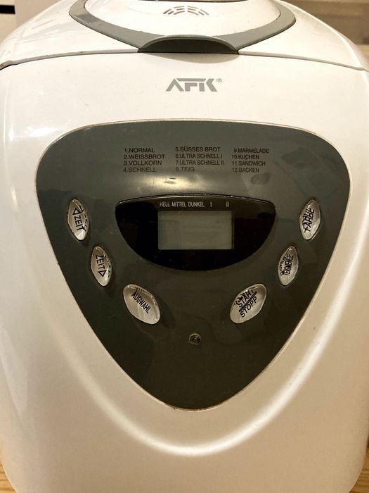 Esta máquina de fazer pão é uma das melhores do seu género. A Afk é uma marca de confiança da Alemanha que comercializa máquinas de fazer pão muito fiáveis. Esta máquina pertenceu à minha mãe e não foi muito utilizada. Está em perfeitas condições e como nova. Não quero começar a fazer pão eu próprio e, por isso, estou a vender esta máquina. É fornecida com um folheto com receitas e todos os outros artigos necessários para um pão caseiro de sucesso.