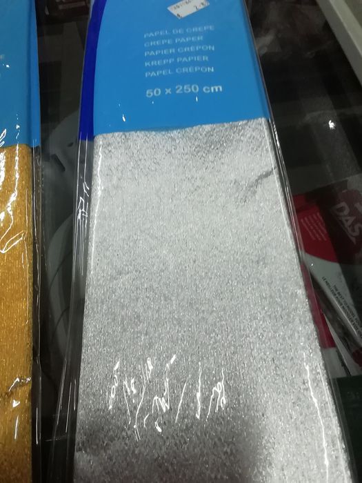 Trinta folhas de papel crepe, da marca Fama, dourado, prateado e metalizado, com 50 x 250 cm, novo, embalado.