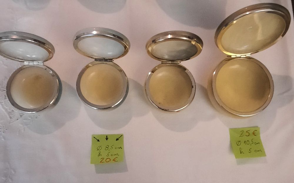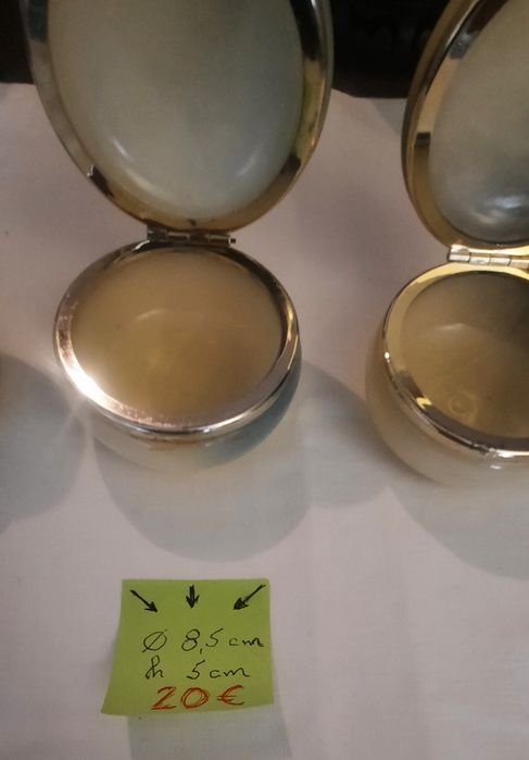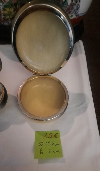 Porta joias em pedra nobre (alabastro?)com tampa fixa em aro metal amarelo (latão). Tampa com pintura
