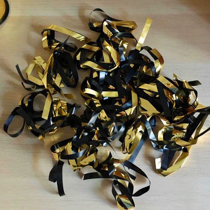 Dois rolos de fita novos e 30 laços em preto e dourado.