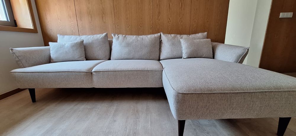Sofá bege Hôma com chaise longue. Duas almofadas incluídas.