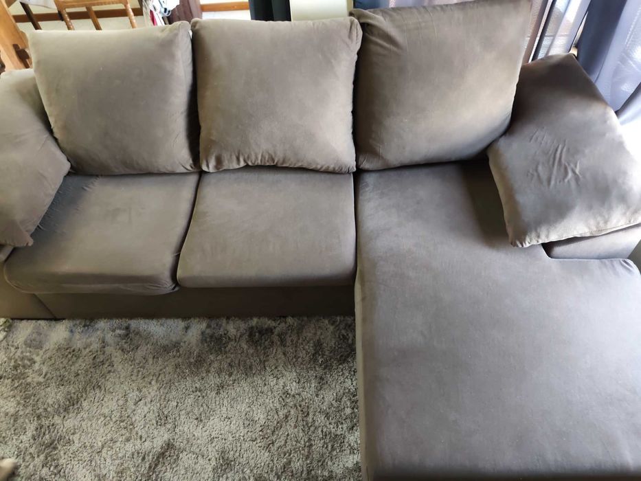 Sofá chaise longue reversível em tons de cinza, em bom estado de conservação. Peça versátil que pode ser utilizada em diferentes configurações para se adaptar ao seu espaço. Ideal para uma sala de estar confortável e acolhedora.