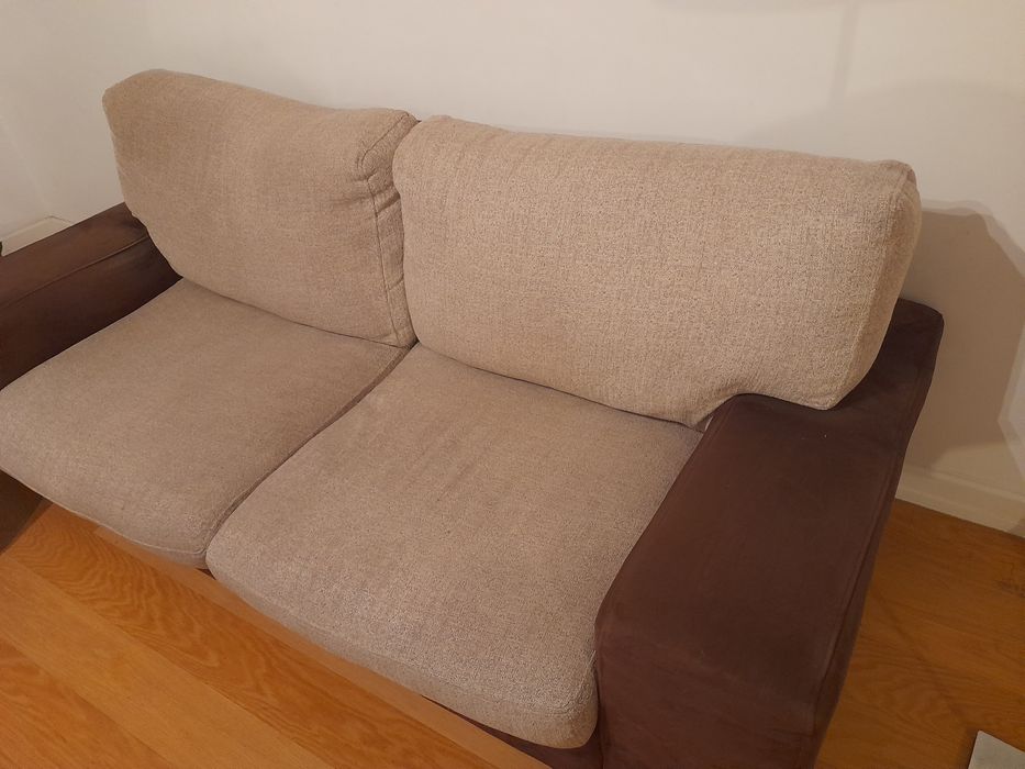 2 sofás com 3 e 2 lugares em tecido com tratamento anti nódoa e lavável, com almofadas confortáveis em bege. Ideal para uma sala de estar acolhedora. Puff da mesma linha dos sofás.