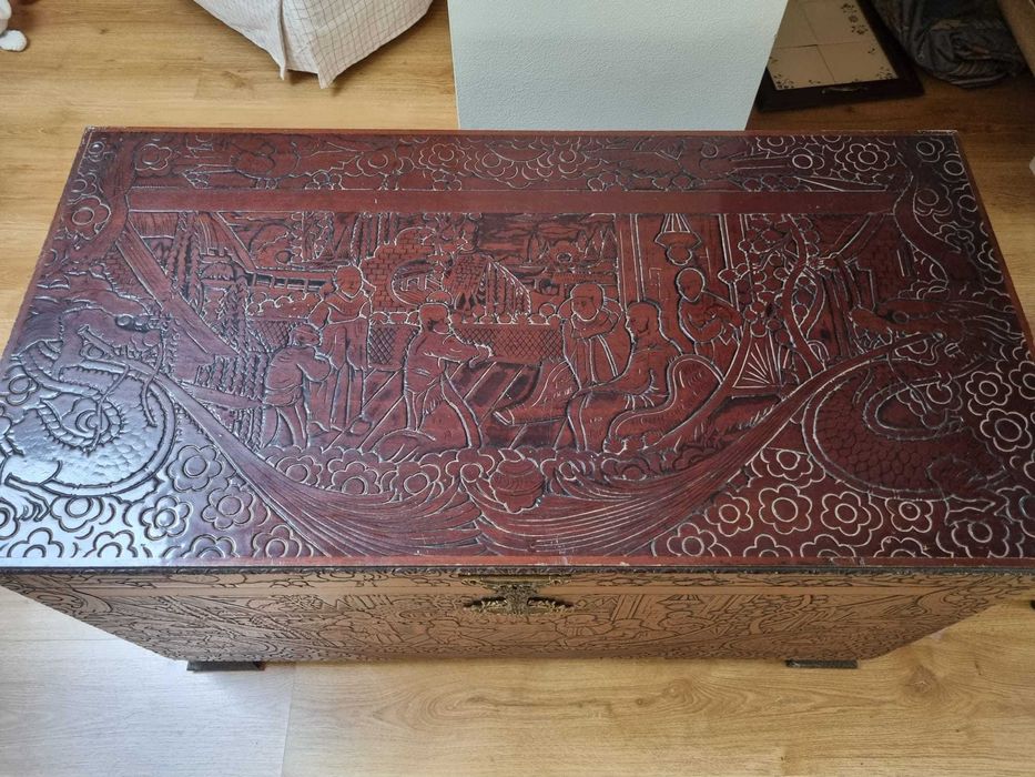 Arca/Baú Chinês Antigo em Madeira Entalhada - Cenas Orientais