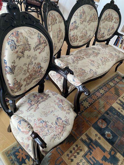 Conjunto de sala antigo — sofá e dois cadeirões em madeira
