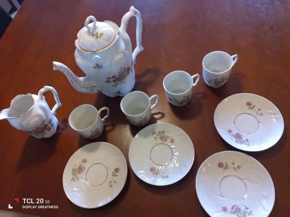 Conjunto de quatro chávenas com pires, bule e leiteira